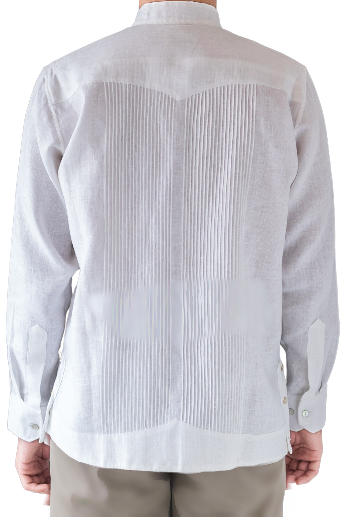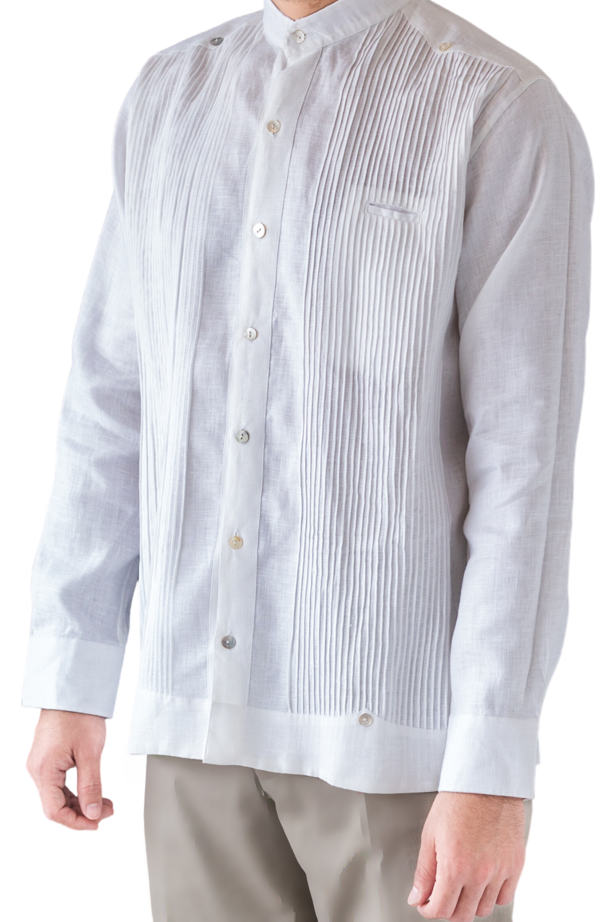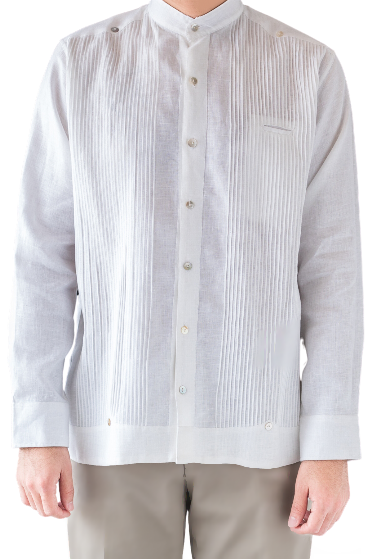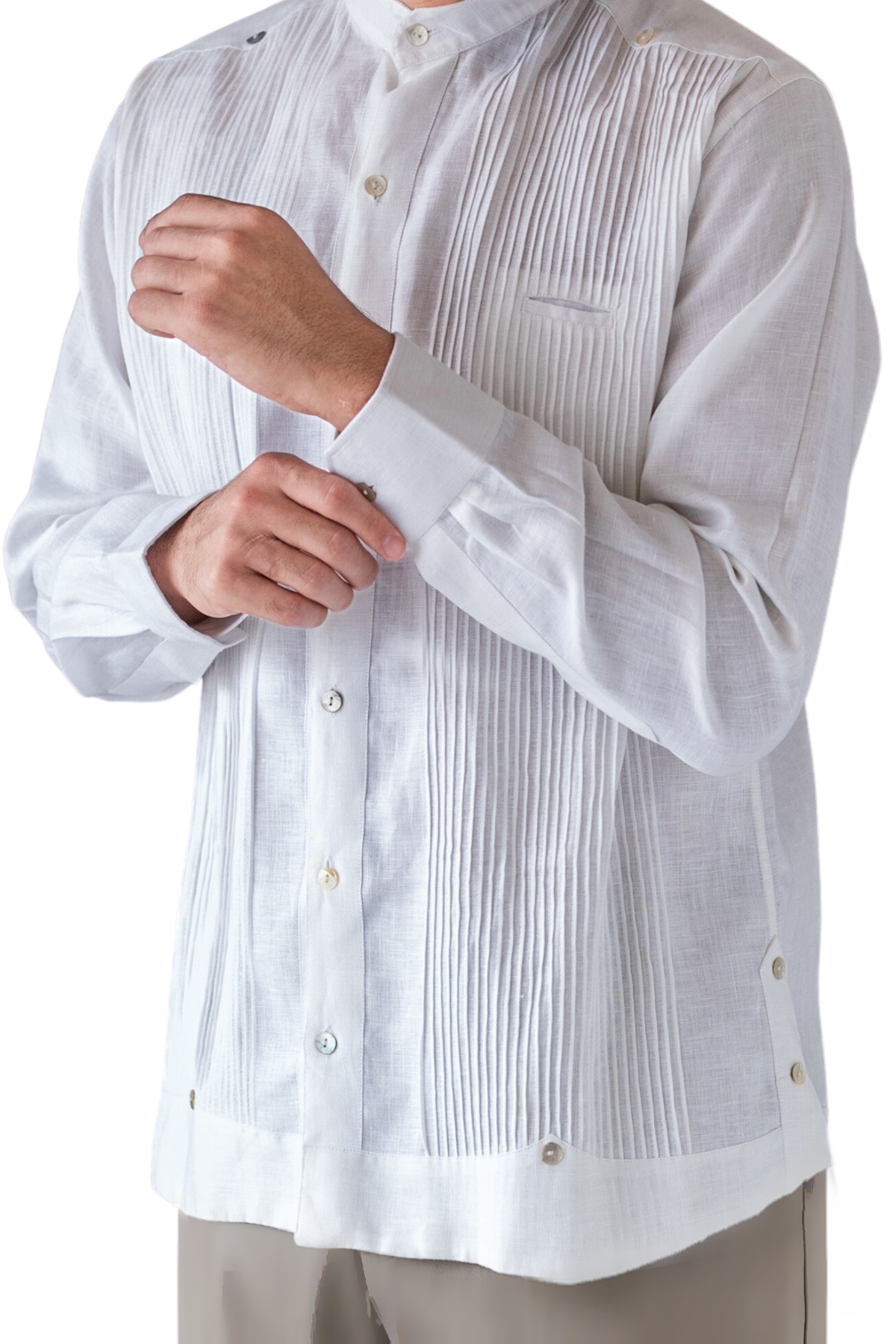 Guayabera blanca de manga larga, cuello alto y bordados laterales a rayas.