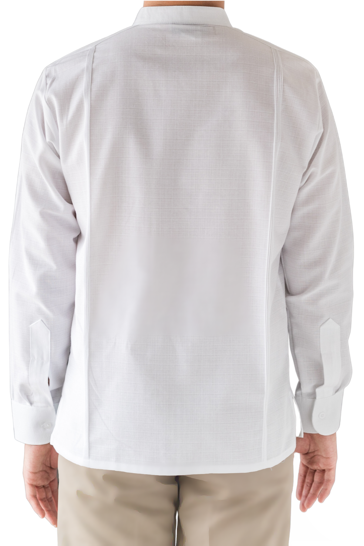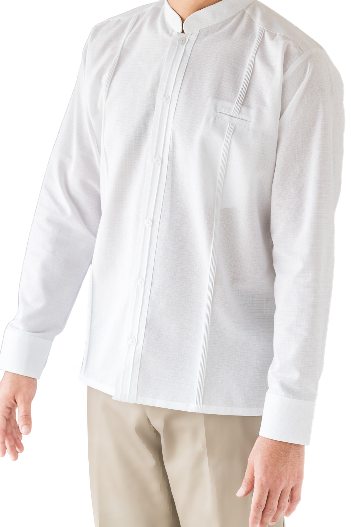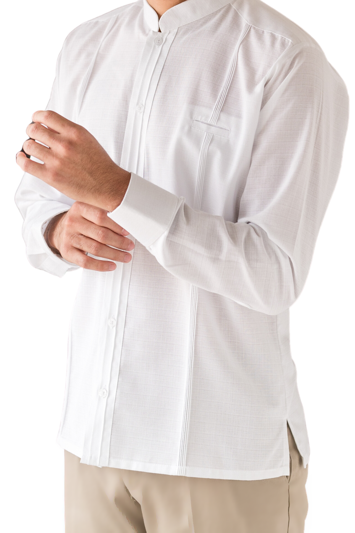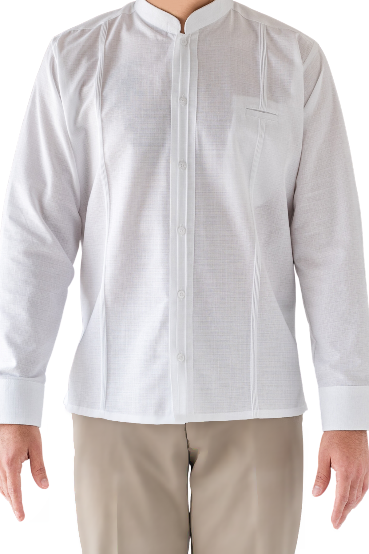 Guayabera blanca de manga larga, cuello alto y bordados laterales.