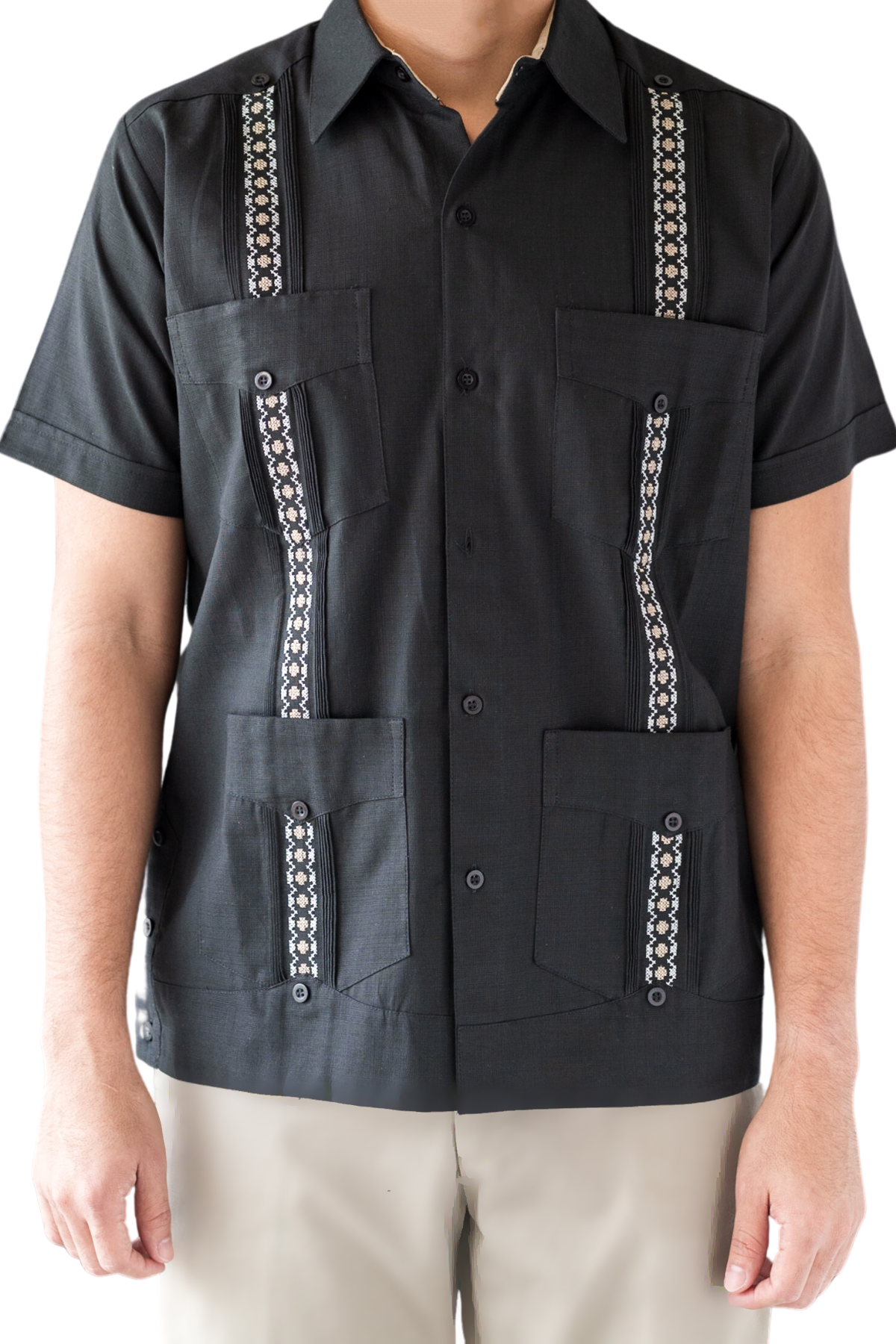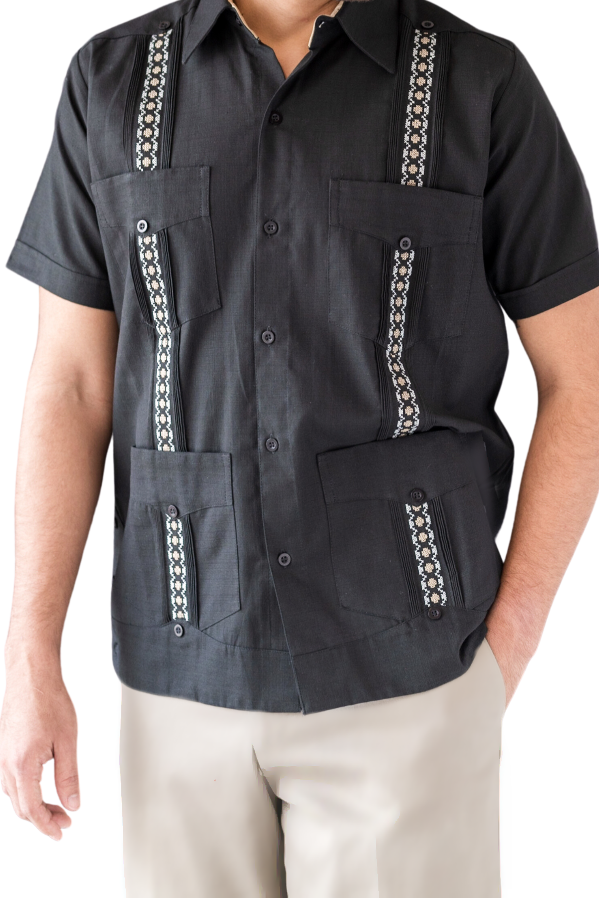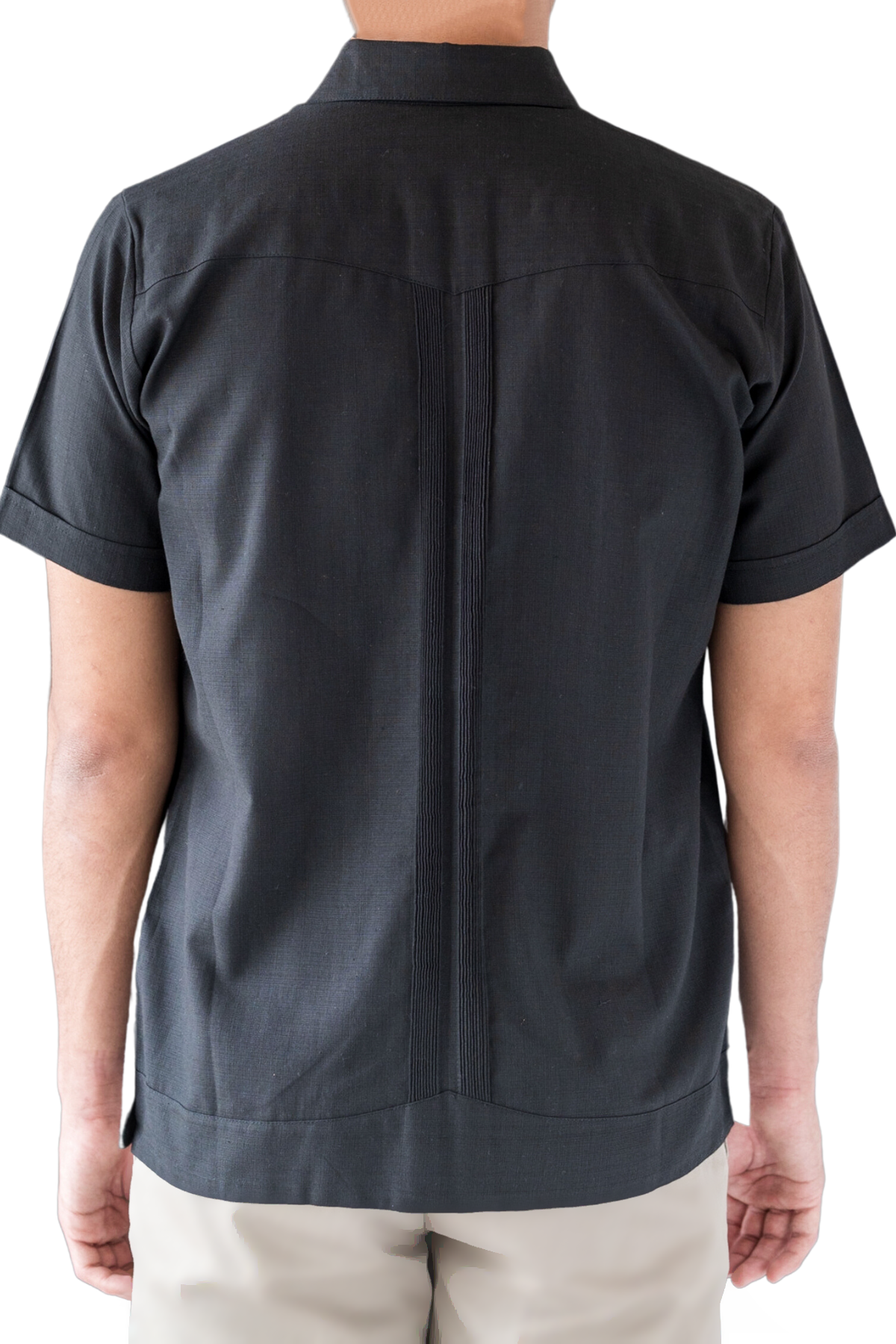 Guayabera tradicional negra con manga corta y bordado artesanal.